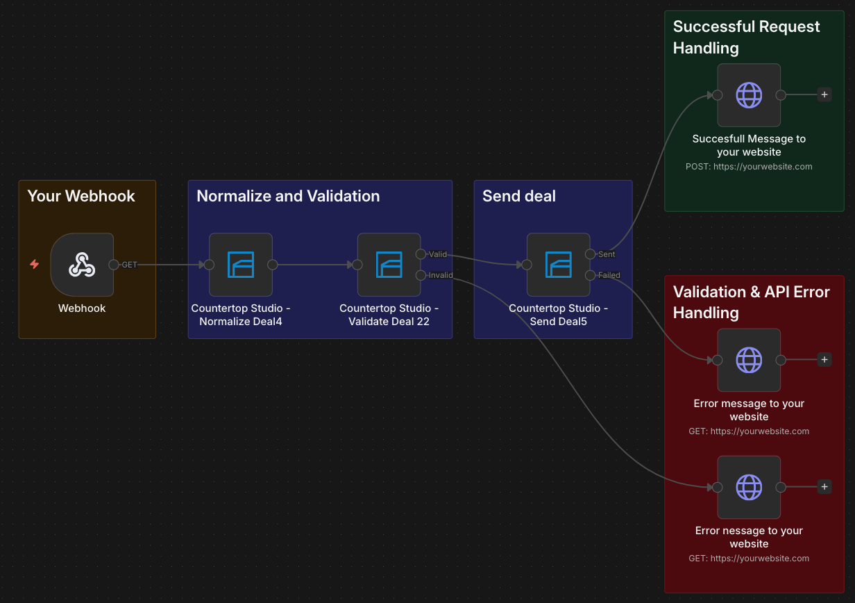 This example demonstrates a structured production setup for creating deals in Countertop Studio.
